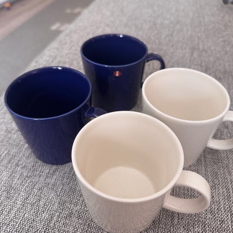 Tummansiniset 3dl Teema-mukit vanhempaa tuotantoa, kruunuleimat pohjassa.