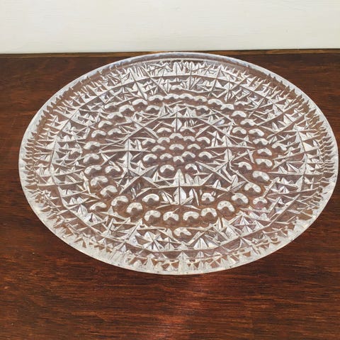 Myynnissä kaunis koristeltu kristallivati, painavahko. Korkeus 3cm, halkaisija 24cm.