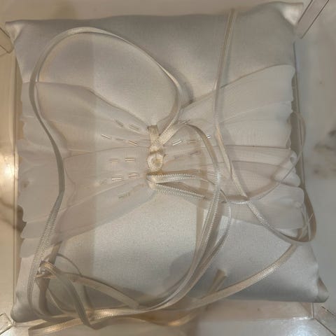 Kaunis valkoinen sormustyyny pitkillä satiininauhoilla.
