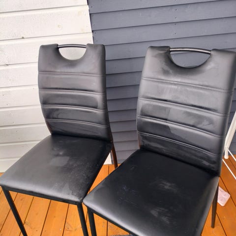 Kohtalaisessa kunnossa olevat ruokapöydän tuolit. Rungot ehjät, kangas päällisissä hieman käytön jälkiä, mutta ehjät.