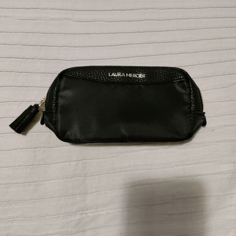 Ruskea tekonahkainen meikkipussi. Korkeus 14 cm, leveys 19 cm, syvyys 7 cm.
