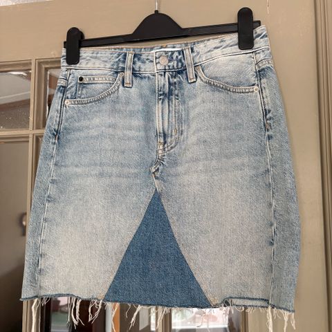 Calvin Klein minihame, koko 12. Vyötärö n. 84 cm. Hameen pituus n. 45 cm. Hameessa on taskut ja sivusaumassa vetoketju. Kangas 100% puuvillaa.