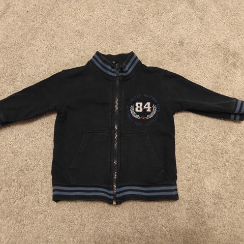 Sini-valkoraidallinen trikootoppi, koko 80 cm. Kaula-aukossa pieni rusetti samaa kangasta. Siisti, kuvissa toki ryppyinen, mutta silittämällä siistiytyy vielä.