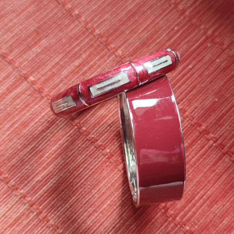 3 kpl rannekoruja, kaksi muovista mustaa ja yksi oranssi on puuta.