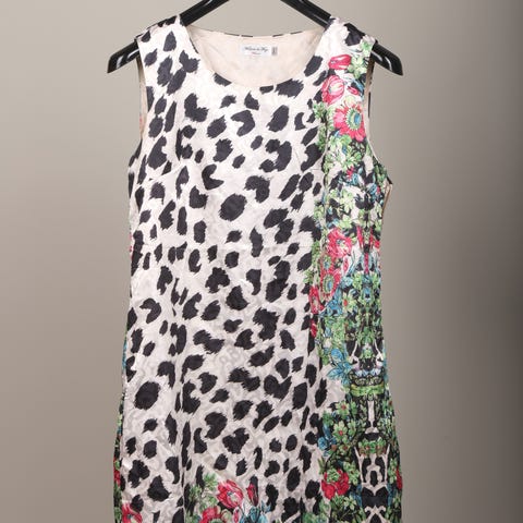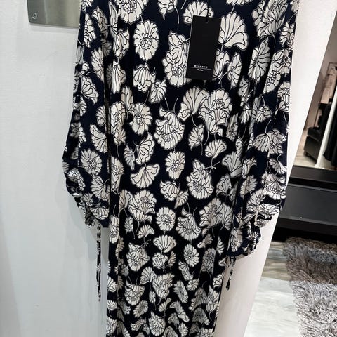Mekko 55% silkkiä ja 45% puuvillaa. Sivussa vetoketju. Olka-helma 97cm. Vyötärö 82cm. Kiva tanssimekko! Mahd. postit ostajalle.