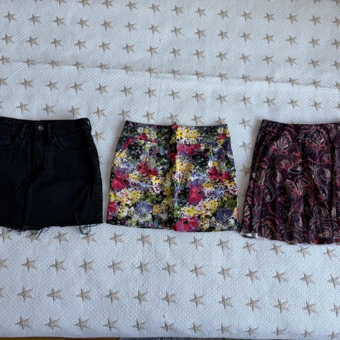 Hamepakettiin kuuluu viisi hametta ja yhdet shortsit. Kaikki hyväkuntoisia. Kaikki kokoa XS tai 34, paitsi Mexx vuorellinen kietaisuhame 36.
