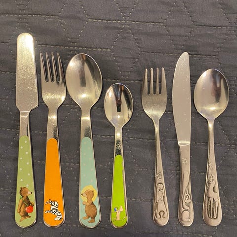 Kuusi kappaletta aterimia lapselle. Aterimien Kuvitus hieman irtoillut ja haalistunut. Olleet pitkään käyttämättä.