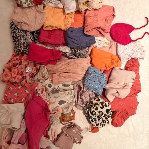 Kaikki 100% puuvillaa, paitsi Moomin, H&M, Pikkuset bodyissä ja Pippi potkuhousuissa 5% elastaania. Kaikissa pesu 40 asteessa, paitsi Pikkuset 60 asteessa. Pippi potkuhousuista ei tietoa, pesulappu leikattu irti. Muut ostettu uutena, paitsi Moomin hankittu käytettynä. Elloksen asuista ja H&M pitkähihaisesta bodyasusta ei varmaa tietoa, luultavasti ostettu uutena. Kaikki puhtaita ja tahrattomia, paitsi purppuranvärisessä Name It -yöasussa pieniä tummia tahroja vasemmalla puolella (kts. kuvat). H&M bodyssä myös pieniä repeämiä kahden nepparin lähellä (kts. kuvat). Kaikki pesty hajusteettomalla pesuaineella.