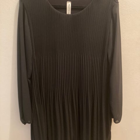 Myydään L-kokoinen tunika. Vyötärön leveys 50 cm. Pituus niskasta helmaan 93 cm. Edessä kaunis kaarroke. Merkki Zeze.