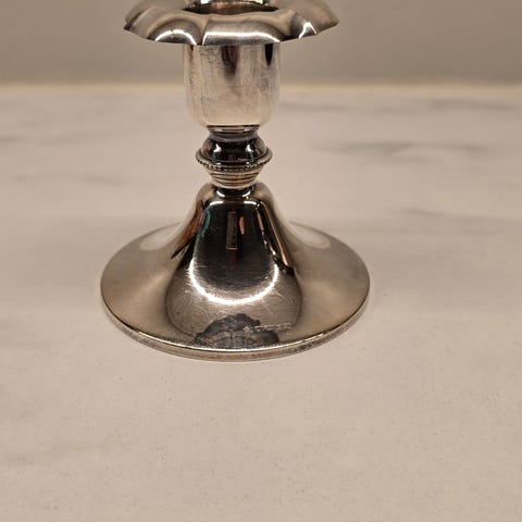 Vanha metallinen kynttilänjalka. Pohjassa merkintä, Yle. Käyttökulumaa.