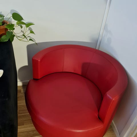50 luvun alun vintage nojatuolit , joissa on puurunko ja punainen verhoilu. Tuoleissa on korkeaselkäinen selkänoja ja käsinojat. Sopii olohuoneeseen tai lukutilaan.