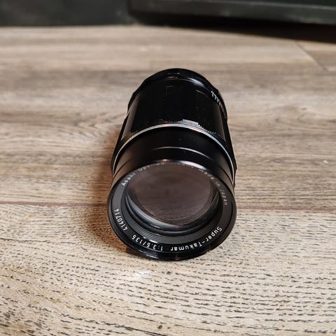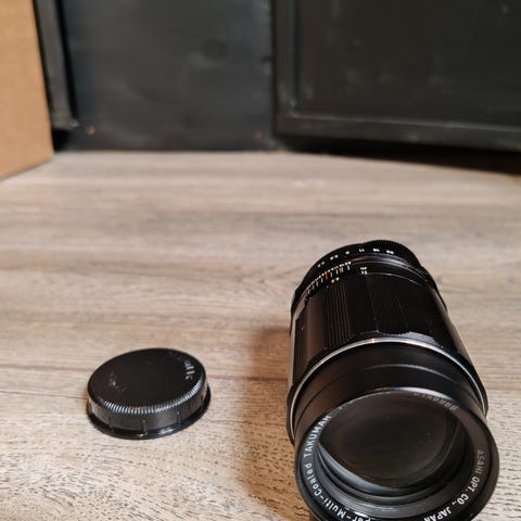 Pentacon Auto 2.8/135mm kameran objektiivi. Musta väri ja kompakti muotoilu. Vintage, manual, M42 thread. Mukana suojakotelo