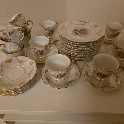 Ehjät,Lysteria maalattu ja 24karaatin kultaus,Kuppi Korkeus 7cm/Leveys 7,5cm,Aluslautanen Leveys 13cm ja Pullalautanen Leveys 16,5cm.Kannun Korkeus 23,5cm ja Sokerikko 12,5cm.Nouto tai jos postitus,ostaja maksaa postikulut.Hinta 55e