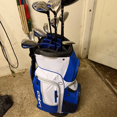 Big Max Aqua kärrybägi vedenpitävä kaikki vetoketjut ehjät. Draiver Cobra speed LD 12 asteinen varsi lite flex.. Puu 3 Baffer 15,5 asteinen varsi lite.. Puu 4 Baffer 26 asteinen varsi vomens flex.. Puu 5 cobra speed LD, varsi vomens flex.. Taylor made hybridi 19 asteinen varsi hyper lite.. Raudat, S,P, 9,8,7,6,5 varsi Regular flex ja PING PUTTERI lisäksi kaupanpäälle Garmin golf gps.