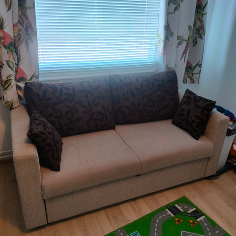 Mökillä käytössä ollut vuodesohva. Hyvä kuntoinen, vaikka käytönjälkiä löytyy hieman. Sohvan väri joistain kohdista aavistuksen haalistunut ja käsinojassa pientä naarmua (viimeinen kuva). Nukkuma asennossa leveys noin 145cm.