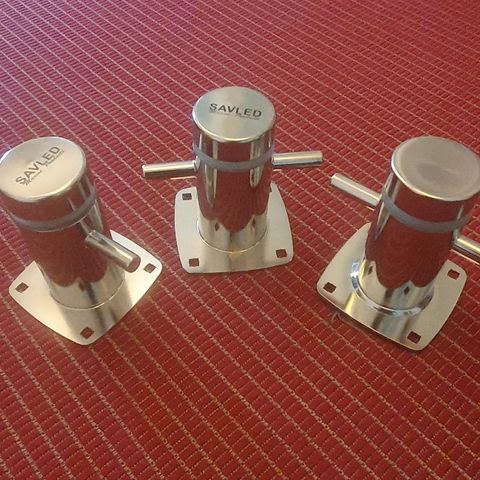 Ruostumattomasta teräksestä valmistetut pollarit veneen kiinnitykseen 2 kpl settinä. Halkaisija noin 10 cm ja jalustan mitat noin 10 cm x 10 cm. Noin 4 - 5 mm levyä. Todella hyvin hitsaamalla valmistetut siistillä hitsisaumalla. 4 kpl kiinnitysreikiä valmiina.