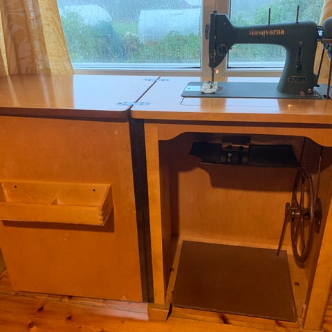 Husqvarna ompelukone, malli 31-20, pöytätaso syvyys 52cm leveys 112cm korkeus 74cm, tarvikevetolaatikko jossa lankoja ja neuloja yms. kone pyörii poljettaessa mutta en itse osaa käyttää.Nouto, toimitus lähiseudulle sovittavissa, saa kysyä, saa tarjota