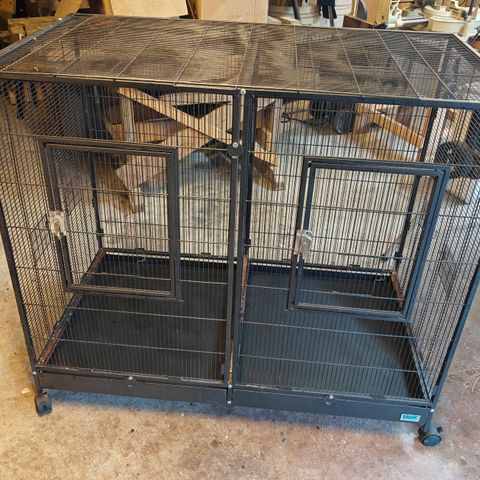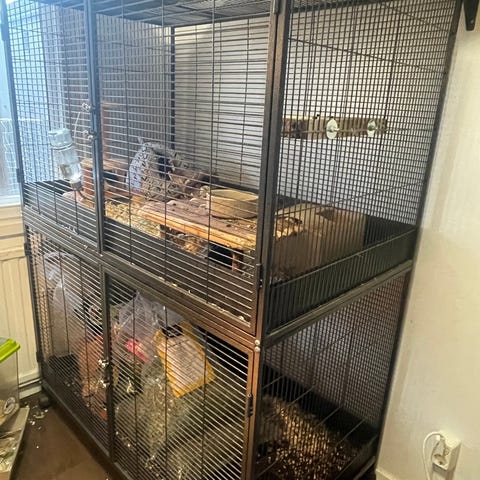 Yksi muovinen pohjalevy lohjennut hieman yhdestä kulmasta ja pari roisketahraa metallilevyissä takana, muutoin häkki on erinomaisessa kunnossa. Sillat käytännössä käyttämättömät, olleet paikallaan vain lyhyen aikaa. Mukaan kuvissa näkyvä tarvikkeisto. Myös lisää (mm. pesuhiekka, omenapuun palat, jyrsintäkeppitelineet) löytyy tarvittaessa, mutta niistä sovitaan erikseen. Myydään koottuna.