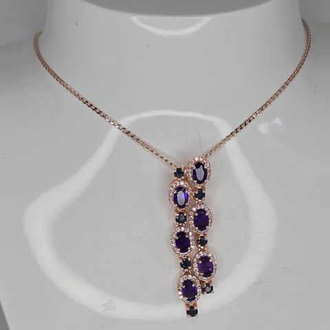 Kaulakoru hopeaa, joka päällystetty 18kt kullalla. Ametisteja yhteensä neljä, kolme pienempää ja yksi isompi, joiden yhteispaino 5,39 karaatia. Ketjun kokonaispituus n. 38cm, joka säädettävissä.