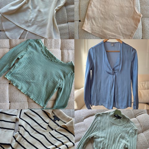 Sitruunankeltainen H&M paitapusero koko 34 ja tummansininen Lindexin Holly Whyte röyhelökaulusreunainen, kultanapillinen pusero koko XS. Pahoittelen, etten ole silittänyt tuotteita kuvaamista varten.
