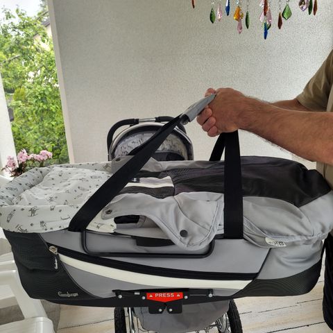 Rattaat ovat vm. 2013 ja renkaat uusittu v. 2021, pakettiin kuuluu: koppa-osa ja sen tekstiilit ja patja, istuin-osa 5-piste vöillä ja kahdella jalkapeitteellä (toinen karvavuorellinen talvikäyttöön), kuomu-osassa mukana aurinko-suoja ja hyttysverkko, sadesuoja omalla suojapussilla, irrotettava alakori (tekstiilissä hieman kulumaa).