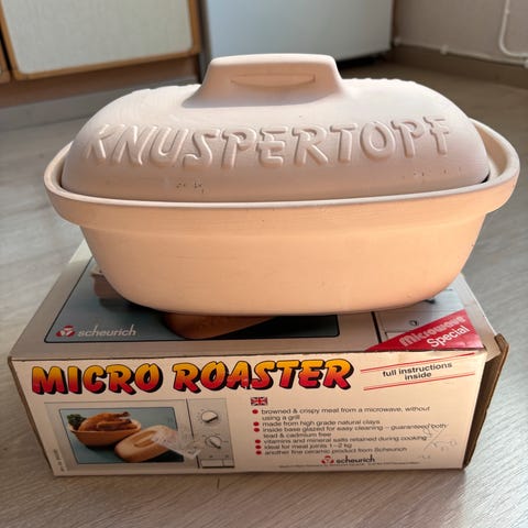 Keraaminen vaalea vuoka jonka avulla saa valmistettua kätevästi ruokaa. Ei ole ollut käytössä vielä, mukana alkuperäinen pakkaus.