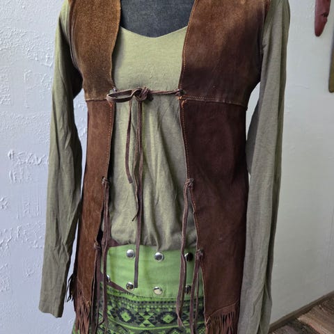 Käsin tehty ja maalattu, koristeellinen liivi pehmeästä mokkanahasta. Jäänyt käyttämättä.