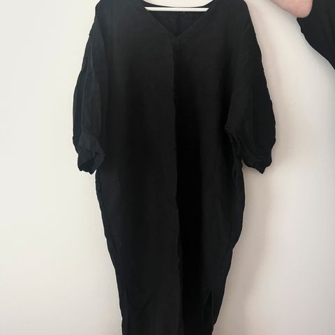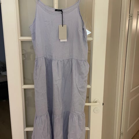Beige pellavamekko helmaröyhelöllä 100% pellava. Kunnossa ei moitteita. Pinnalla pellavakankaaseen kuuluvaa nyppyä. Valmistajalta lainattu tarkempi kuvaus: Kevyesti A-linjaisessa hihattomassa mekossa on pyöreä pääntie, jonka takana on nappihalkio. Mekon edessä on rintamuotolaskokset ja sivusaumassa on taskut. Mekon helmassa on leveä poimutettu kaitale.