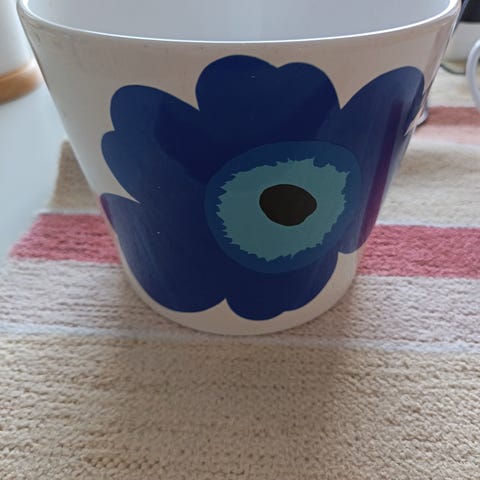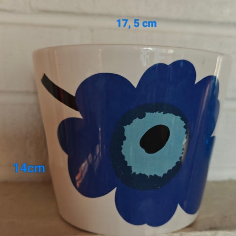 Myyntiin erittäin hyväkuntoinen (uudenveroinen) Marimekko Unikko-kukkaruukku. Yläosan sisähalkaisija noin 16 cm ja alaosan ulkohalkaisija noin 13,5 cm. Korkeus noin 14 cm. Savuton ja eläimetön talous. Nouto, postitus tai Toridiili. Postikulut lisätään hintaan.