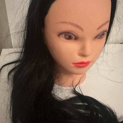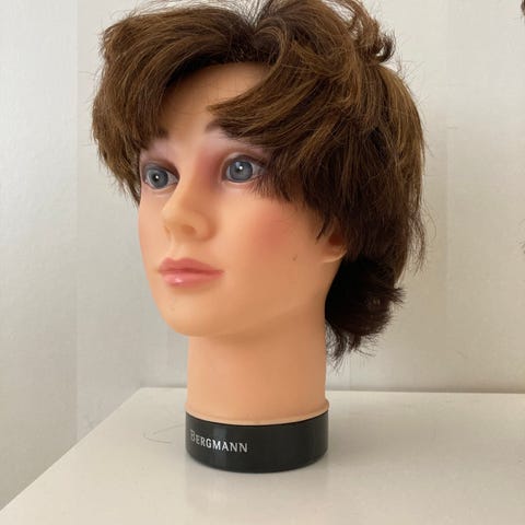 Kampaamoliikkeestä ostettu oikea harjoituspää. Vähän käytössä ollut. Oikeat hiukset puolipitkät. Saat tarvittaessa lisäkuvia!
