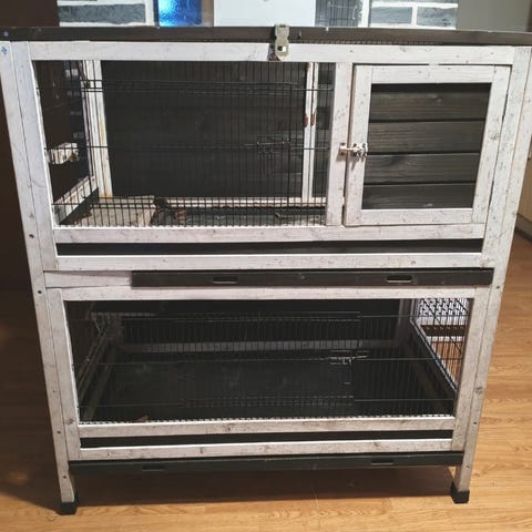 Aika kolutun näkönen ritilikkö. ollu kanilla nukkuma paikkana. Pohja on pinttyny mutta saa varmaa jollai tärpätillä ja lastalla raaputettus irti. Pohjassa on viritetty renkaat että siirtäminen sujuis helposti. 46cm korkea,138cm pitkä, 70cm leveä