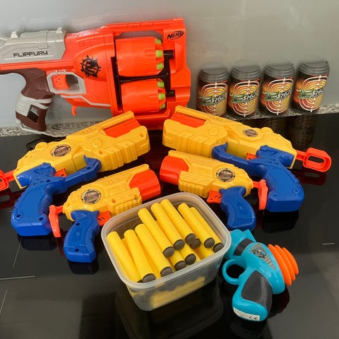 Nerf lelupyssyjä ja panoksia. Joukossa myös yksi ns. merkitön pyssy. Nouto mahdollinen Akaa, kulkeutuu myös Tampereelle omien menojen mukaan.