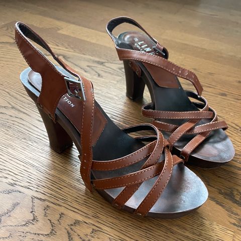Korkea korkoiset mustat sandaalit. Takana vetoketju kiinnitys. Viimeisessä kuvassa näkyy, että toisessa kengässä edessä, varpaiden alla on jonkinlainen pehmuste. En repinyt irti. Ei tunnu käytössä.