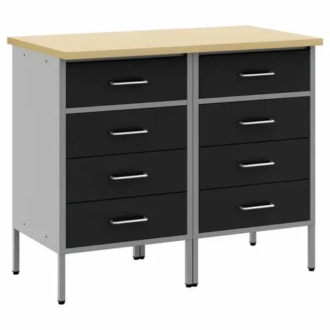 Vankassa työpöydässä on runsaasti säilytystilaa ja 500 kg kantavuus. Tämä iso ja tukeva pöytätaso tarjoaa vakaan alustan kaikille korjaustöillesi. Työpöydässä on kuusi vetolaatikkoa, mikä varmistaa, että pystyt järjestämään työkalut, osat ja lisälaitteet, kuten ruuvit, naulat ja teipit hyvin. Kaikki laatikot on varustettu laakerimekanismilla sujuvaa liukumista varten. Siinä on kaksi hyllyä ja suuri osasto kahdella lukittavalla ovella, jotta porat, johtokelat ja hiomakoneet voidaan sijoittaa helposti. Jalkojen korkeus on säädettävissä. Tämä työasema on valmistettu laadukkaasta teräksestä ja teknisestä puusta, joten se on erittäin tukeva, kestävä ja helppo puhdistaa. Se on helppo koota.