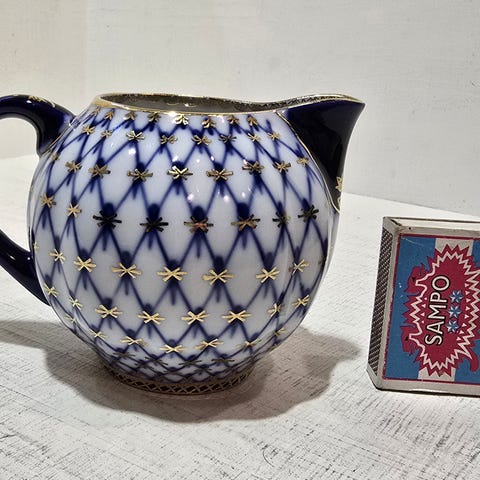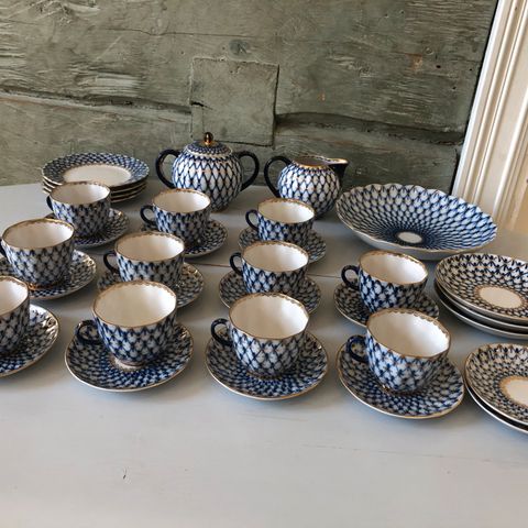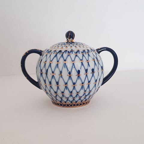 Lomonosov sininen verkko, Cobalt Net sokerikko, tästä puuttuu kultaukset. Punaisella leimalla. Nouto tai postikulut ostajalle. Toridiili ei käytössä.