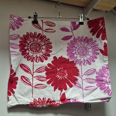 Kirjailulangat muutamassa punaisessa kukassa osin purkautuneet. Takaa vähän nyppyyntynyt.