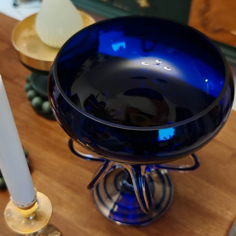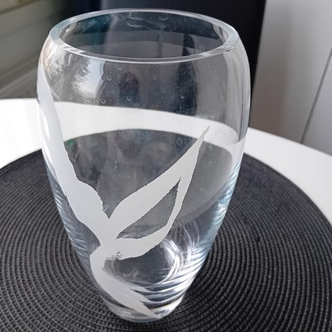 Ihana sinisestä lasista 20 cm korkea ja halkaisija 12 cm.