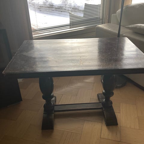 Jalopuuviilutettu vanha pöytä. Pöytä hankittu vuonna 2020 Hämeenlinnasta ja myyjä tiesi sen olevan lähtöisin Hämeenlinnan viinatehtaan edustustiloista. Pöydän kansi on joskus hiottu ja lakattu ja muut pöydän osat näyttäisivät olevan alkuperäisellä lakkapinnalla. Pöydässä on vähäistä kulumaa ja pöydän pinnan lakkauksessa on pienen pieniä halkeamia. Pöydän saa purettua osiin.
