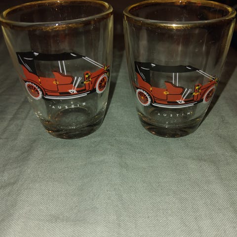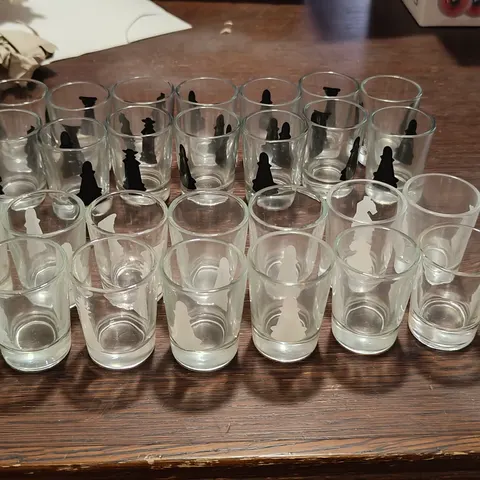 Tyylikäs setti kirkkaasta lasista valmistettuja shottilaseja, joissa kullanväriset koristelistat. Lasit ovat siistejä ja ehjiä – täydellinen lisä juhlapöytään tai baarikaappiin