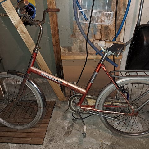 Ajan patinoima terassipyörä. Toimiva dynamovalo. Joskus polkiessa tulee "tyhjä lyönti", eli nykäisee mutta harvoin. Kokeilemalla selviää.
