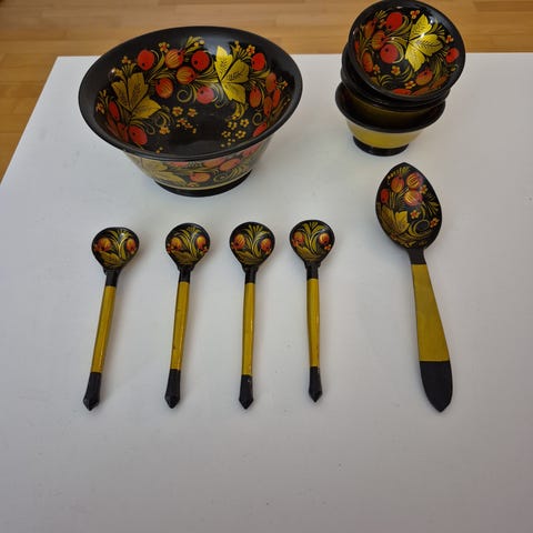 Khokhloma-esineet, kuten kuvassa näkyvät kulhot ja lusikat, ovat yleisiä venäläisissä kodeissa ja niitä käytetään astioina, tarjoiluastioina ja koriste-esineinä.