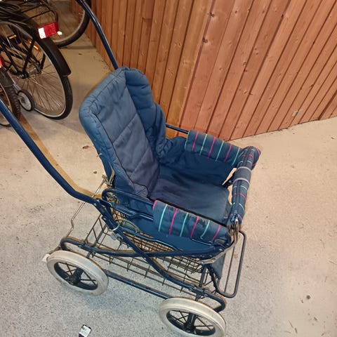 Hienot entisöidyt lastenkärryt vetoaisalla ja kahvalla. Kärryt on vanhat ja uudistettu 2001-vuonna, josta historiaa kärryn pohjassa.