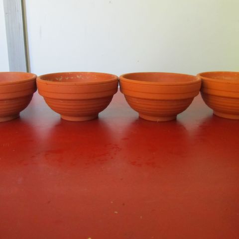 Neljä kpl PIENIÄ, korkeus 8cm ja ruukun halkaisija 7 cm nättejä kaktusruukkuja erilaisilla kuvioilla. Aluslautanen on kiinteä, osa ruukkua. Yhdessä halkeama, mutta liimattu ja ruukku on täysin käyttökelpoinen