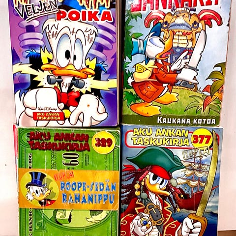 42cm korkea pino Aku Ankka ja Roope-setä taskukirjoja -lehtiä.