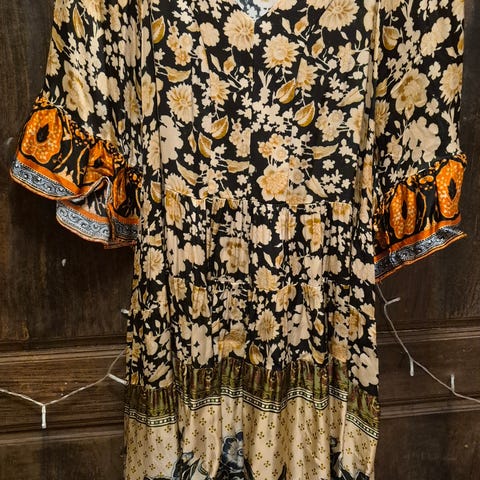 Upea Andiatan ruusuprintti juhlamekko. Tyylikkäitä ja käytännöllisiä yksityiskohtia. Pitkä vetoketju selässä, varsin helppo pukea. Vuoritettu, pl. hihojen osuus. Hihan mitta noin 3/4, hihansuissa lovet. Vyötäröllä epäsymmetrisesti frillaa. Tyylikäs, ei rypisty (polyesteri, ei joustava). Kerran juhlittu, ei pesun tarvetta.