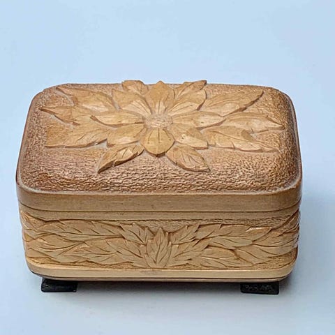puinen rasia, joka on koristeltu monimutkaisilla geometrisilla kuvioilla.