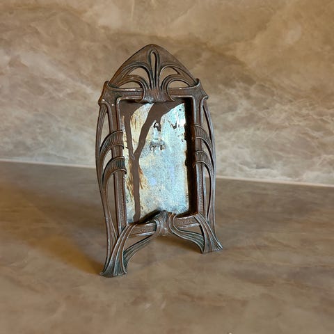 Hieno kolmisävyinen art deco kehys, kuvateline. Kuva tai lasi liu’itetaan kahden pystyssä olevan reunan väliin.