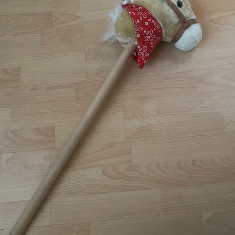 Myyntiin pieni mustavalkoinen keppihevonen. Hevosen mukaan tulee keppi, sekä kuvassa näkyvä punainen riimu/suitset ja siihen ohjat.
