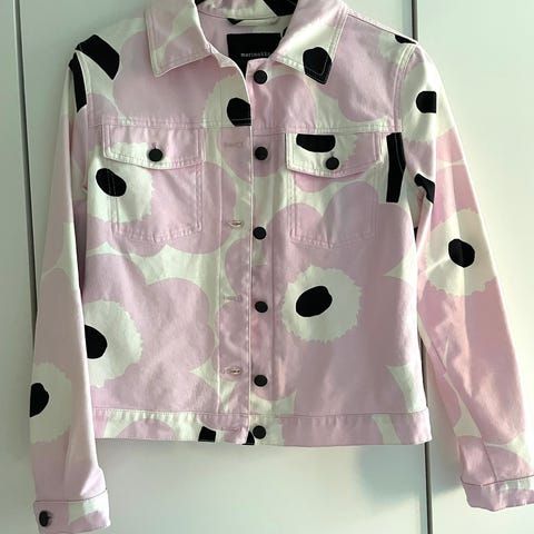Marimekon siisti farkkutakki klassisella unikkokuviolla. Unikot asettuu takkiin kivasti. Koko 34, mutta menee 36-kokoiselle: kainalomitta n. 46 cm ja olka-helmamitta n. 52cm.
