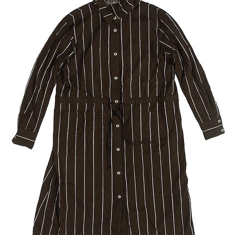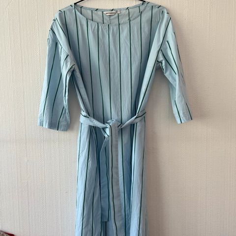 Materiaali puuvillaa, väri ruskea pohja jossa vaaleita raitoja. Mitat k-k 52 cm, pit. 63 cm. Jakussa taskut ja vyö. Käytetty pari kertaa ja todettu koko itselle epäsopivaksi.